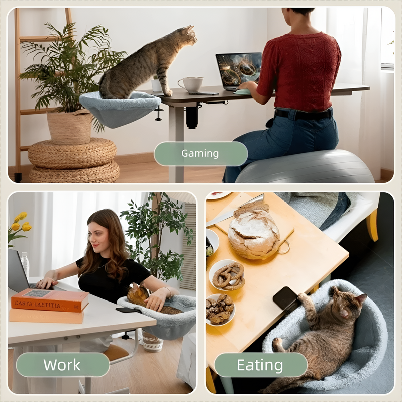 Install the clamp hammock under any desk to free desktop space. Your cat gets a cozy, elevated bed while your keyboard and monitor stay clear, keeping work and play separated for calmer mornings and focused evenings.